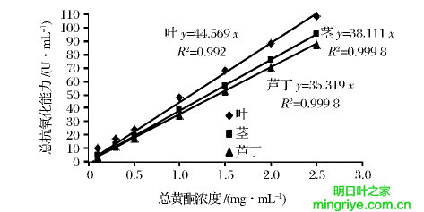 取10g明日叶的叶片乙醇浸提物粉,用体积分数65%乙醇溶解,配250mL溶液,测定其吸光度为2.901,根据芦丁标准曲线回归方程换算叶样液总黄酮质量浓度为4.27mg/mL。取15g明日叶的茎乙醇浸提物粉,同样方法配成100mL溶液,测得其吸光度为2.110,茎样液总黄酮质量浓度为3.17mg/mL。将上述2种样液准确稀释为0.1、0.3、0.5、1.0、1.5、2.0、2.5mg/mL不同浓度溶液,以芦丁为对照样,采用总抗氧化能力(T-AOC)测定试剂盒法测定样品总抗氧化能力。抗氧化物质能使Fe3+还原成Fe2+,后者可与菲啉类物质形成稳定的络合物,通过比色可测出抗氧化能力的大小。具体操作参照南京建成生物工程研究所提供的总抗氧化能力(T-AOC)测定试剂盒说明书。